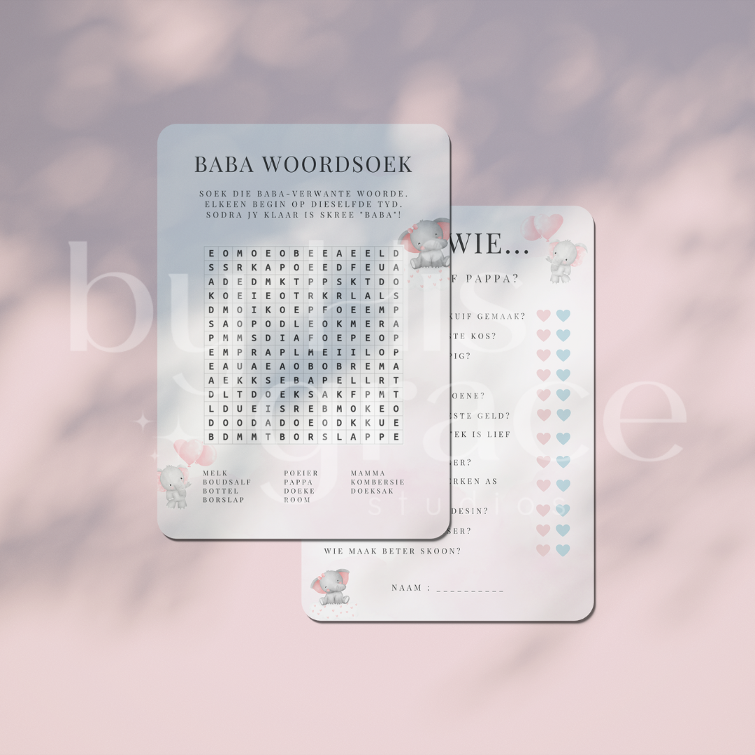 Dit sluit 5 speletjies in : Baba woordsoek, Sal mamma eerder…, Raai Wie (Mamma of Pappa), Wie ken Mamma die Beste en Wense vir Baba